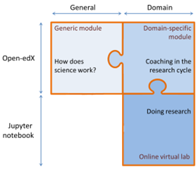 - Discipline-specific module. In this module, students are guided through the steps of the scientific method by conducting their own research: first guided, later more freely. As in science, peer-to-peer feedback is an important aspect here. Because a research object is required for conducting research, this module focuses on a specific research domain, namely the environmental sciences.