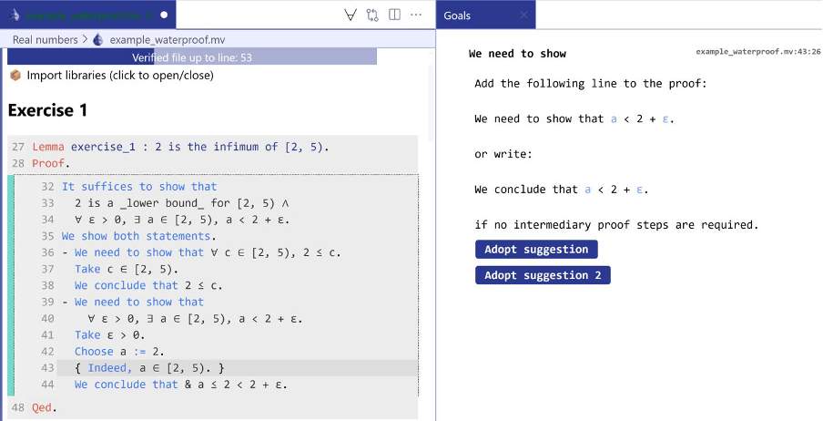 General scope: In this project we will support pilots with Waterproof in Groningen, in the Analysis course taught by Marcello Seri, and at TUD in the Problem-solving and Proofs course taught by Bart van den Dries. We will focus on developing exercises, creating documentation both in written and video form, and on further developing the software.