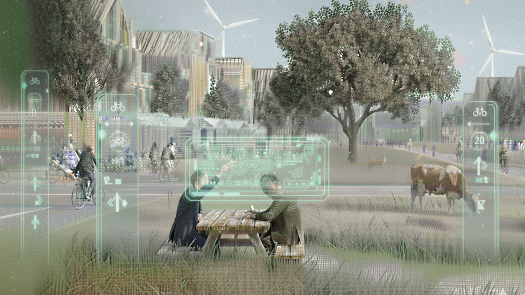 Een met AI gecreëerde schets van Bram de Vos en Stefan Aarninkhof die onderdeel zijn van het stadsbeeld waar zij in de toekomst deel van zouden willen uitmaken: meer technologie, meer groen, minder auto's, hogere kwaliteit van leven.