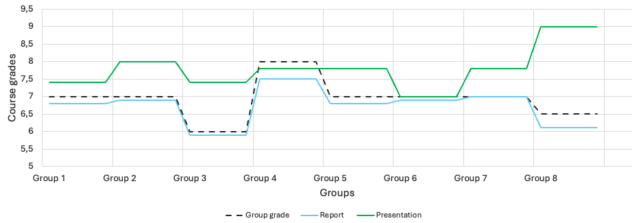 Figure 3: Final course grades, with report grade (blue), project presentation (green) and group grade which depends also on collaborative performance (black dashed line).