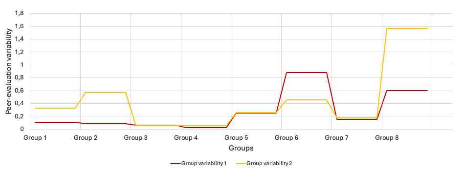Figure 2 shows that apart from Groups 6 and 8, variability in peer-evaluations is low at initial stage of the course (less than 0.3). This means that students are comfortable working with one-another, focused on the same goal, and having same expectations of the project. For some groups (Groups 3, 4, 5 and 7) the variability between two assessment moments does not change suggesting that students still have the same goals and expectations as their peers and that they contribute to the project equally. Â For other groups, variability at later stages of the course changes up to 97% (which is also seen in peer-evaluations on Figure 1). Here, self-reflection and personal coaching of some students in collaboration and other skills helped students improve (i.e., the variability for Group 6 decreased). For some it did not and other students (also visible in peer-assessment on Figure 1) began contributing more to the project creating bigger variability in peer-evaluations.Â