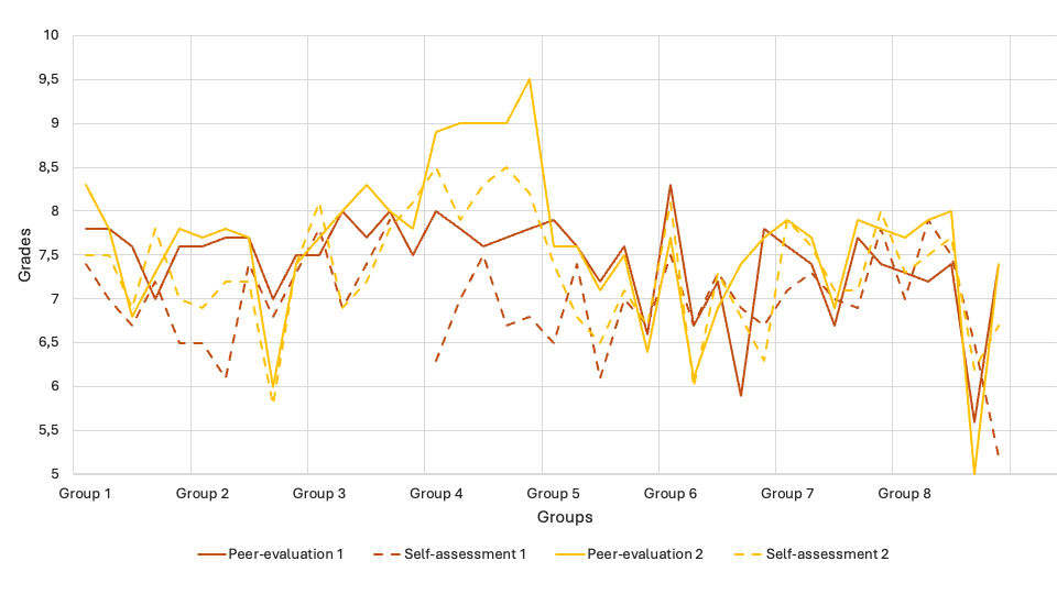 We can also see that self-assessments are consistently lower during both evaluation phases, suggesting that students cannot objectively evaluate themselves, i.e., they lack the skill of critical self-assessment. The  discrepancies between self- and peer-evaluations for certain groups (e.g., Groups 4 and 8) might indicate differences in perception of contribution or performance within those teams. This can also be seen on Figure 2, representing the variability in peer-evaluations between group members at two stages of the course, i.e., proposal stage (dark red line) and final report stage (yellow line).