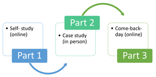 - An online come-back day (1,5h) was used to address any remaining questions that remained after the on-campus day and that may have arisen after applying new insights in a work setting.