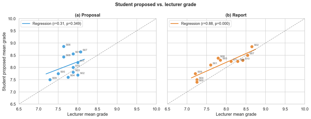 Figure 2: Alignment between student-proposed and lecturer-assigned grades in the Proposal (a) and Final Report (b). Each point represents one student (n = 11). The coloured line shows the linear regression; the dashed line represents perfect agreement. Pearson correlation coefficients and significance levels are reported in each panel.