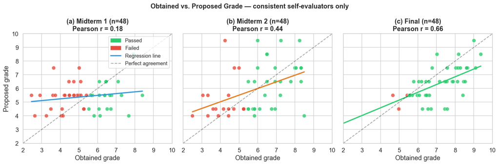 To investigate whether students' ability to accurately assess their own performance improves over the course of the semester, we analysed the relationship between obtained and student-proposed grades across three consecutive assessment moments (see Figure 3). Only students who completed a self-evaluation at all three time points were included in this analysis (n = 47), ensuring that the observed trends reflect genuine development in self-assessment behaviour rather than differences in cohort composition between exams. This approach allowed us to distinguish between self-assessment as a skill — the ability to judge one's own performance — and self-assessment as a reflection of content knowledge, since the same students were tracked as their familiarity with the course material grew.