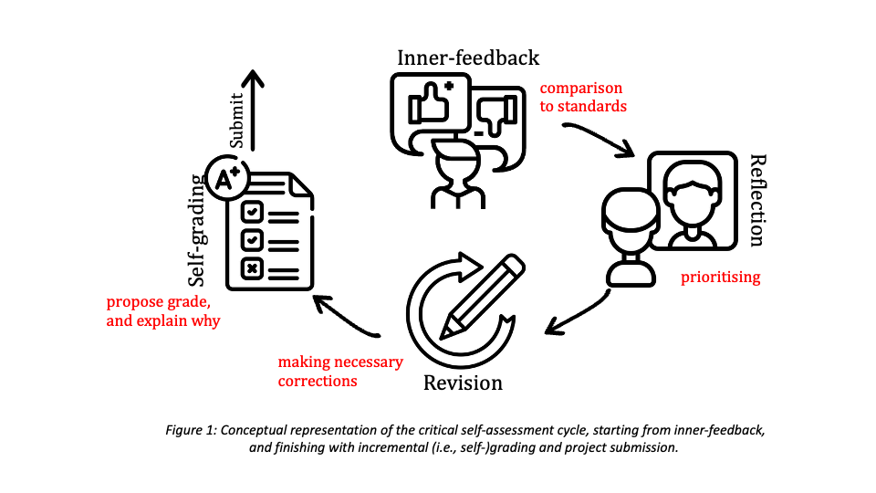 - The project builds on two established concepts in higher education: inner-feedback (Nicol, 2020) — the knowledge students generate when comparing their own performance against reference standards — and incremental grading (Köppe et al., 2020) — a student-driven assessment approach in which students grade their own work using defined criteria