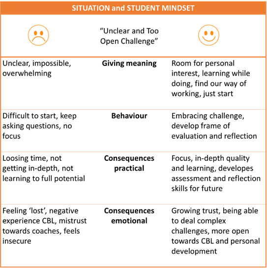 An example of addressing a certain situation (‘gebeurtenis’) of an ‘unclear and too open design challenge’ with a more or less positive mindset: giving meaning (‘betekenisgeving: gevoel en gedachten’), behaviours (‘gedrag’), and consequences (‘gevolg’) practically and emotionally.