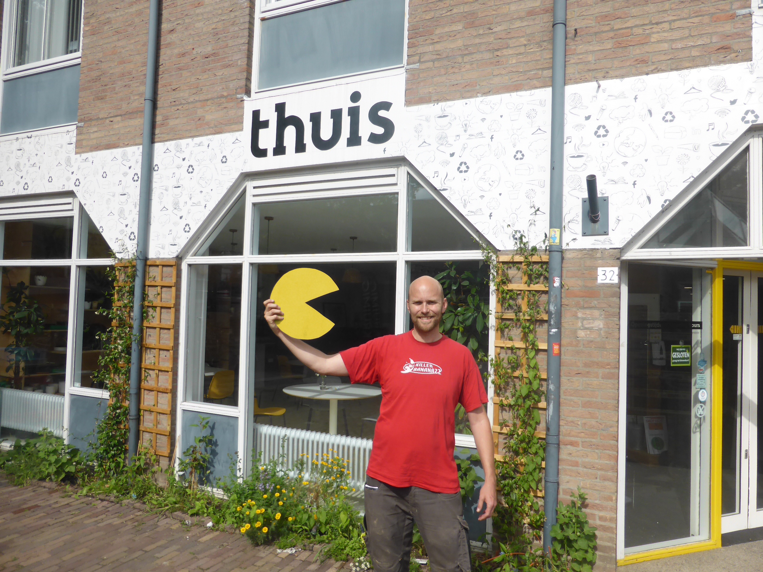 In July-August I presented a computer game in which you move a “pacman” to eat or avoid chicken, steak, bread, cheese, algae, insects, nuts and beans. The game is controlled with giant red buttons for left and right, spaced so far apart that two players are needed. To collaborate, discussion is needed about the aim of the game and thus about the environmental effects of animal and vegetable proteins. I deliberately presented this in a public space in Wageningen’s shopping center.
