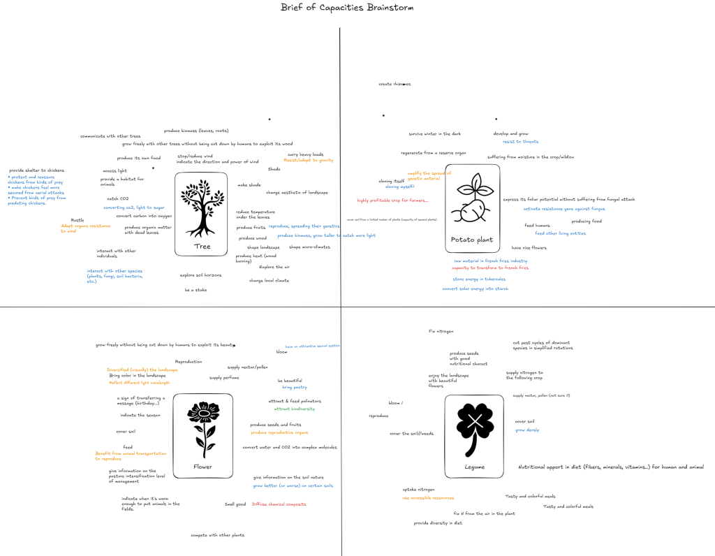 First, a non-human entity in the agricultural system is studied mainly for its capacities. For a plant, these can be rooting, producing leaves, converting solar energy into biomass, etc. Next, we challenge people to think about what the living entity would require from its surroundings to be comfortable, looking at the inclusion of agency, temporality, and deliberation. Next, we ask participants to rephrase the capacities of plants identified (if needed).