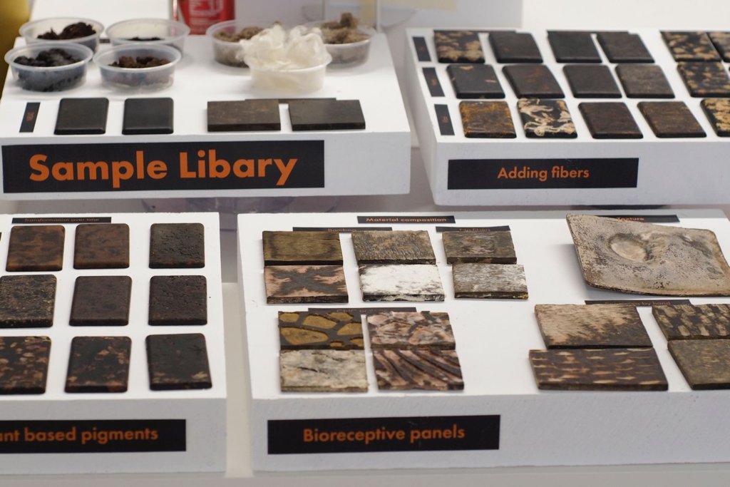 In Living Traces, we explore how to create an evolving aesthetic for N8040 that conveys its sustainable nature. We were inspired by natural materials like leather and wood that age with grace and collaborate with nature instead of working against it. Imperfection is implemented in the production process to create a natural aesthetic by adding fibres coloured with fungi and bio-based pigments. Practices like sandblasting, accelerated weathering, and lab experiments are used to simulate the effects of wind, moisture, UV and biological colonisation on the aesthetics of the material. This enables designers to anticipate and design for decay, leveraging it as a design opportunity. The result is a series of facade panels, one that gradually reveals flax fibres, one with wool that develops a patina over time, and two bio-receptive panels that invite algae or mycelium growth. These panels gain value over time and embrace imperfection, impermanence and transformation.
