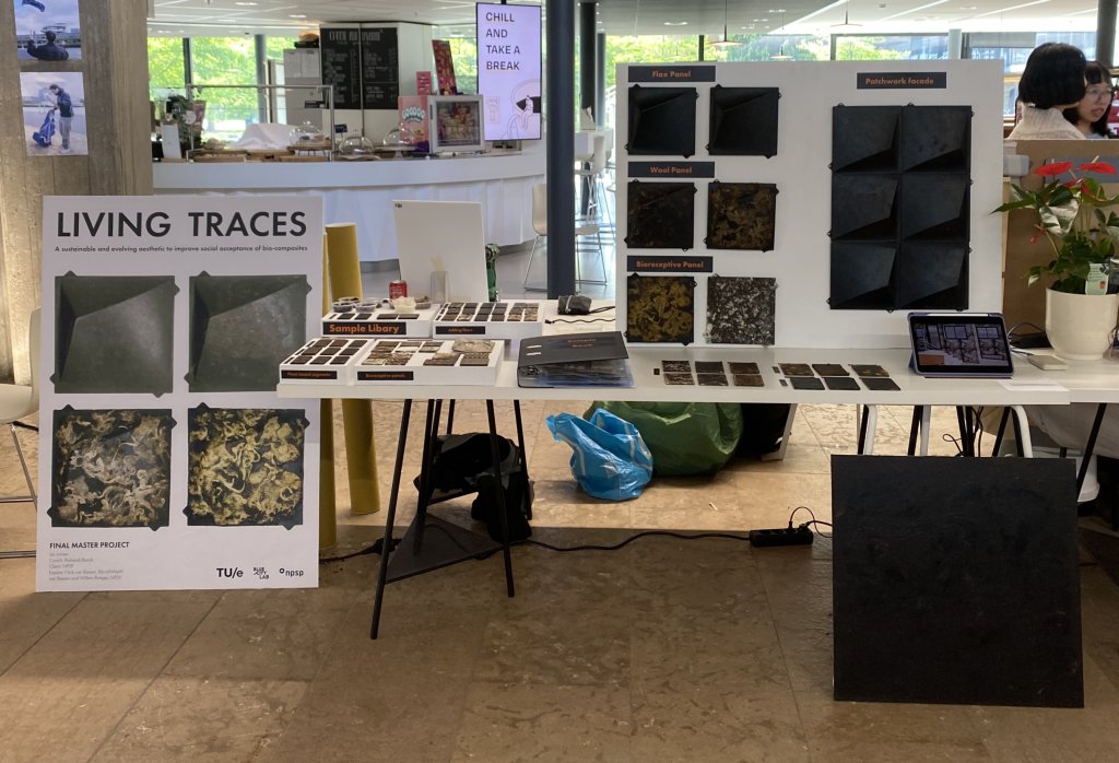 The bio-composite N8040 developed by NPSP is 100% bio-based and holds great potential as a sustainable material. However, its black resin limits the possibility of incorporating pigmentation, giving it low user ratings on beauty and expected sustainability. This reflects a broader issue, as sustainable materials struggle with social acceptance because they lack desirability, fail to clearly communicate their natural origin, and are prone to decay. This conflicts with our aesthetic model where materials are expected to remain perfect and unchanged for centuries. Living Traces explores how to create an imperfect and evolving aesthetic for N8040 that conveys its sustainable nature. We ask: what if decay is not a weakness, but a design tool to create facade panels that become more interesting with time?