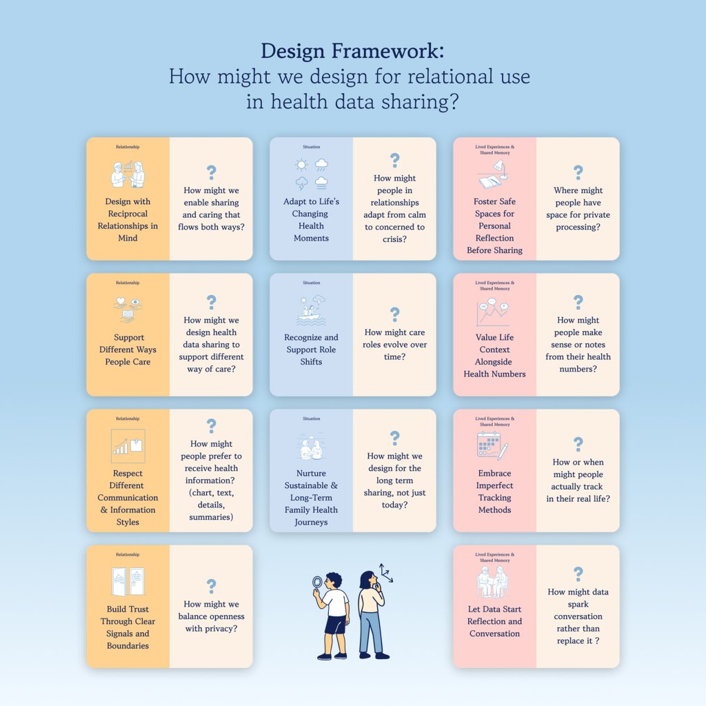 These insights informed eleven design principles for "How might we design for relational use in health data?" organised around three pillars: designing with relationships, adapting to changing health situations, and honouring lived experiences behind numbers.