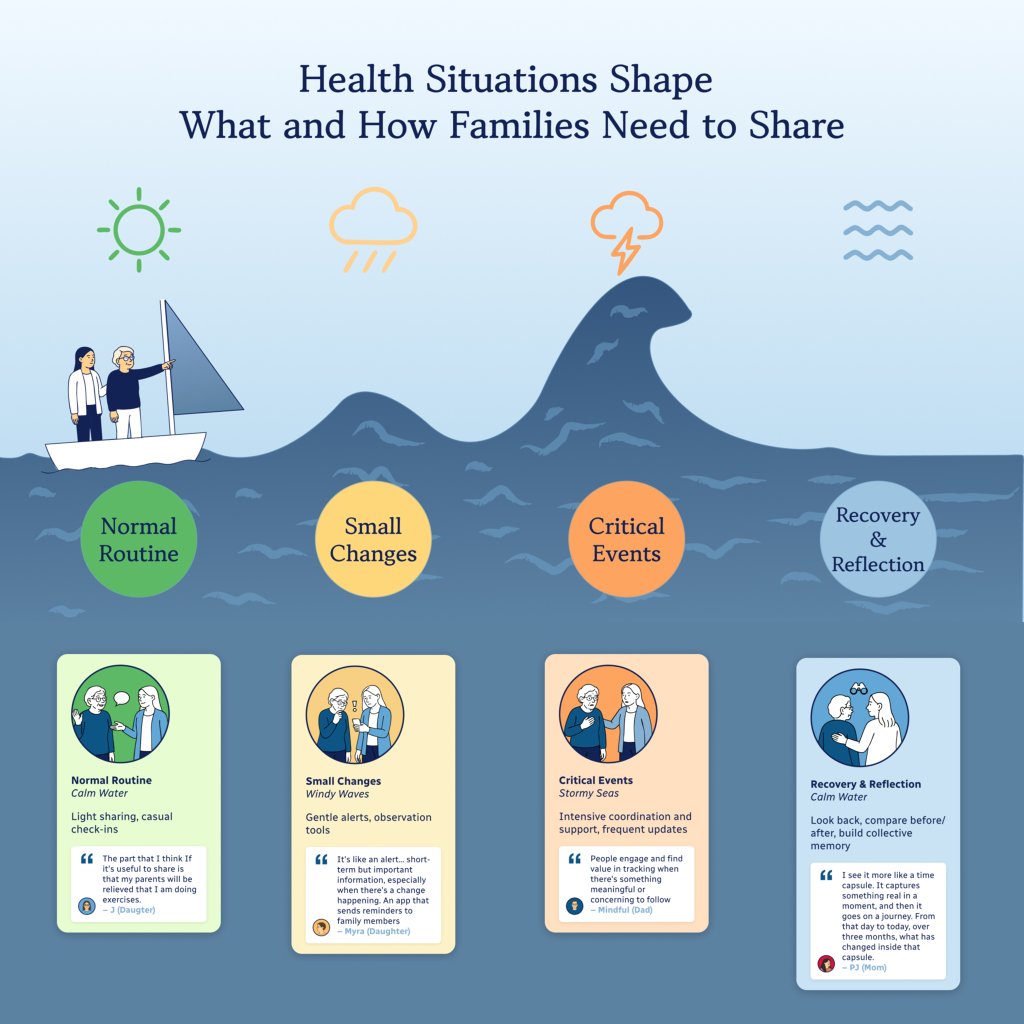 Three key perspectives emerged around a central insight: families navigate health like waves of care, from stable periods with casual check-ins, through small changes requiring gentle alerts, to critical events demanding intensive coordination together. We identified four sharing patterns: from Independent Trackers to Data Collaborators, that shift dynamically as situations change. Families need both personal safe spaces for private reflection and shared collective spaces for mutual understanding, built through trust and intentional sharing where families add their own context to health numbers.