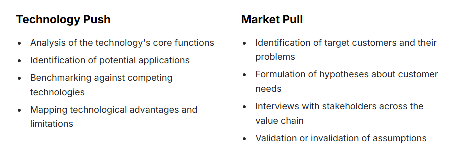 Projects alternate between technology push and market pull until both converge into a validated and quantified opportunity. Market learning is driven through structured outreach — direct introductions, LinkedIn, and industry events — generating high-quality insights through interviews rather than desk research alone.