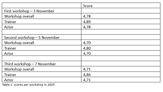 Both the trainer and the training actor were highly praised for their contributions. Participants commended their professionalism, engagement, and the practical value of the role-playing exercises, which were deemed instrumental in enhancing learning outcomes.