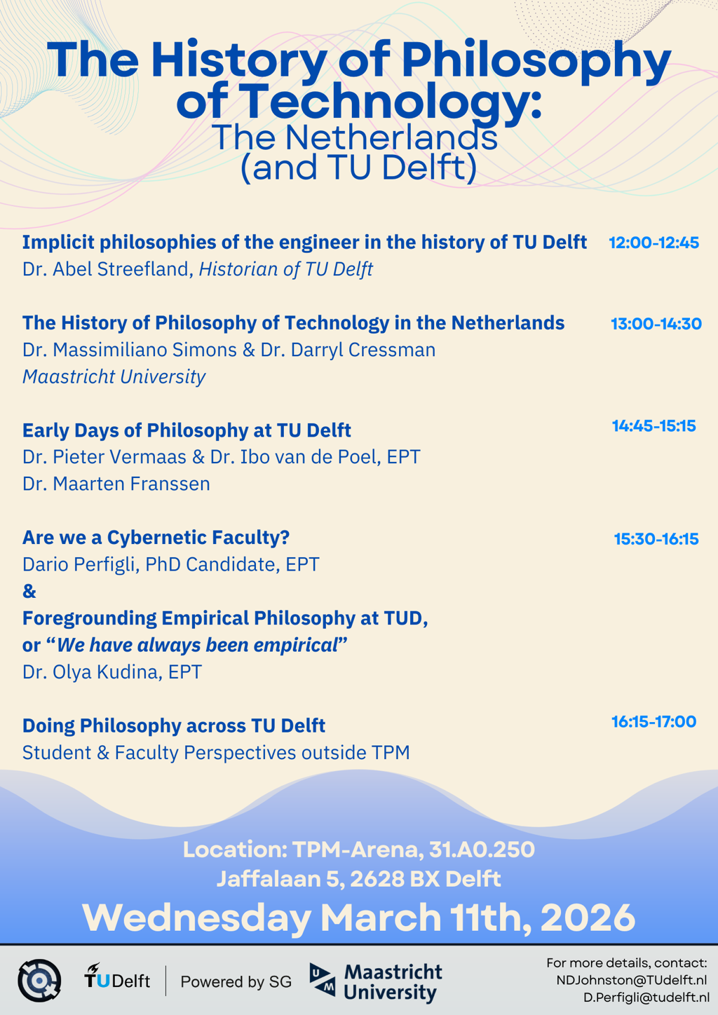 Through this workshop, consisting of a series of presentations and panel discussions, we reflect on philosophy at TU Delft through a historical lens. While in the last years it has become clearer what sort of reflections philosophers have about technology, we have fewer reflections on how philosophical practice has changed as a result of technical innovations, institutional settings, and cultural, economic, and political forces. To gain context, we set our day against the backdrop of the philosophy of technology in the Netherlands more broadly.